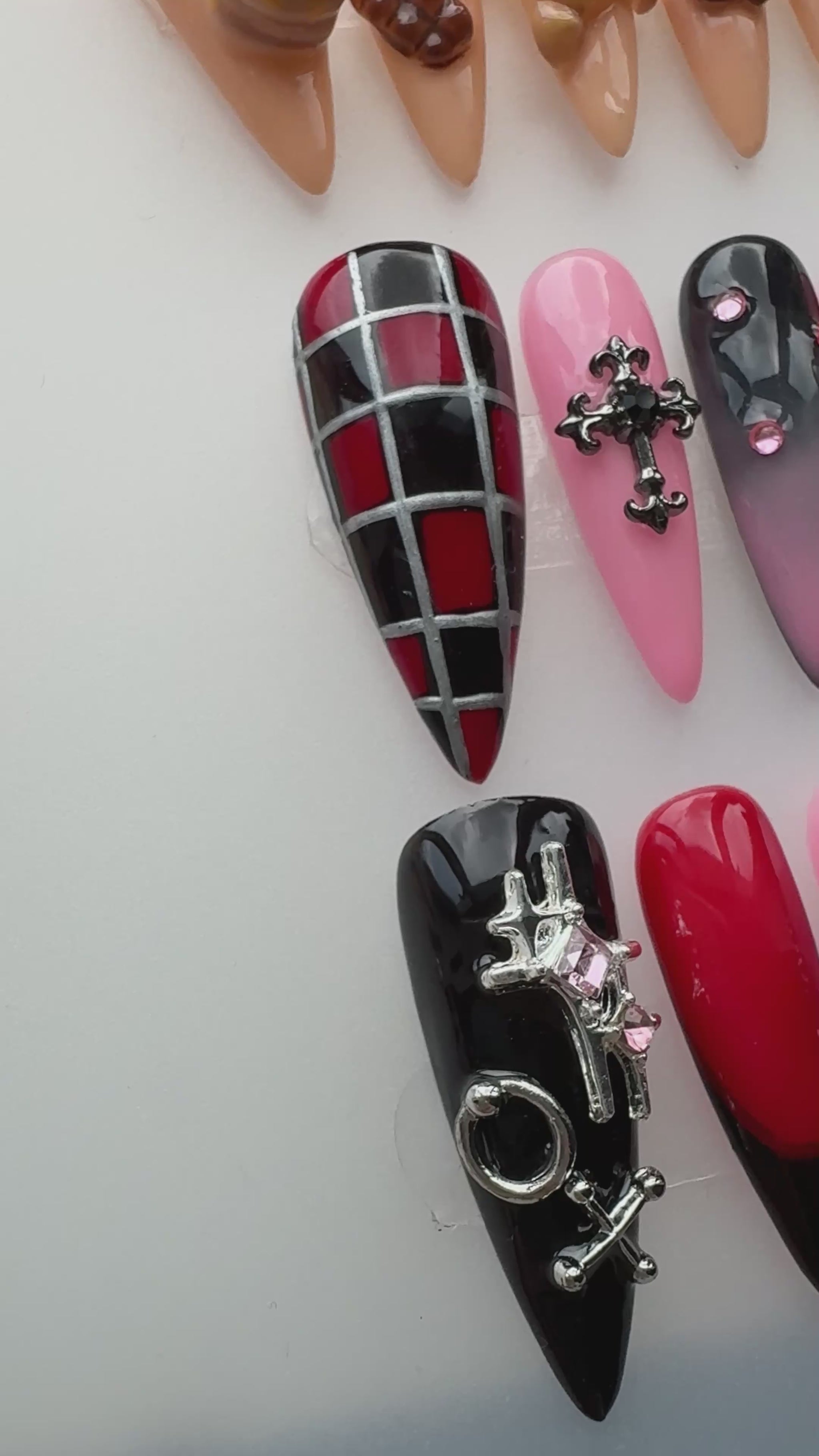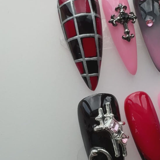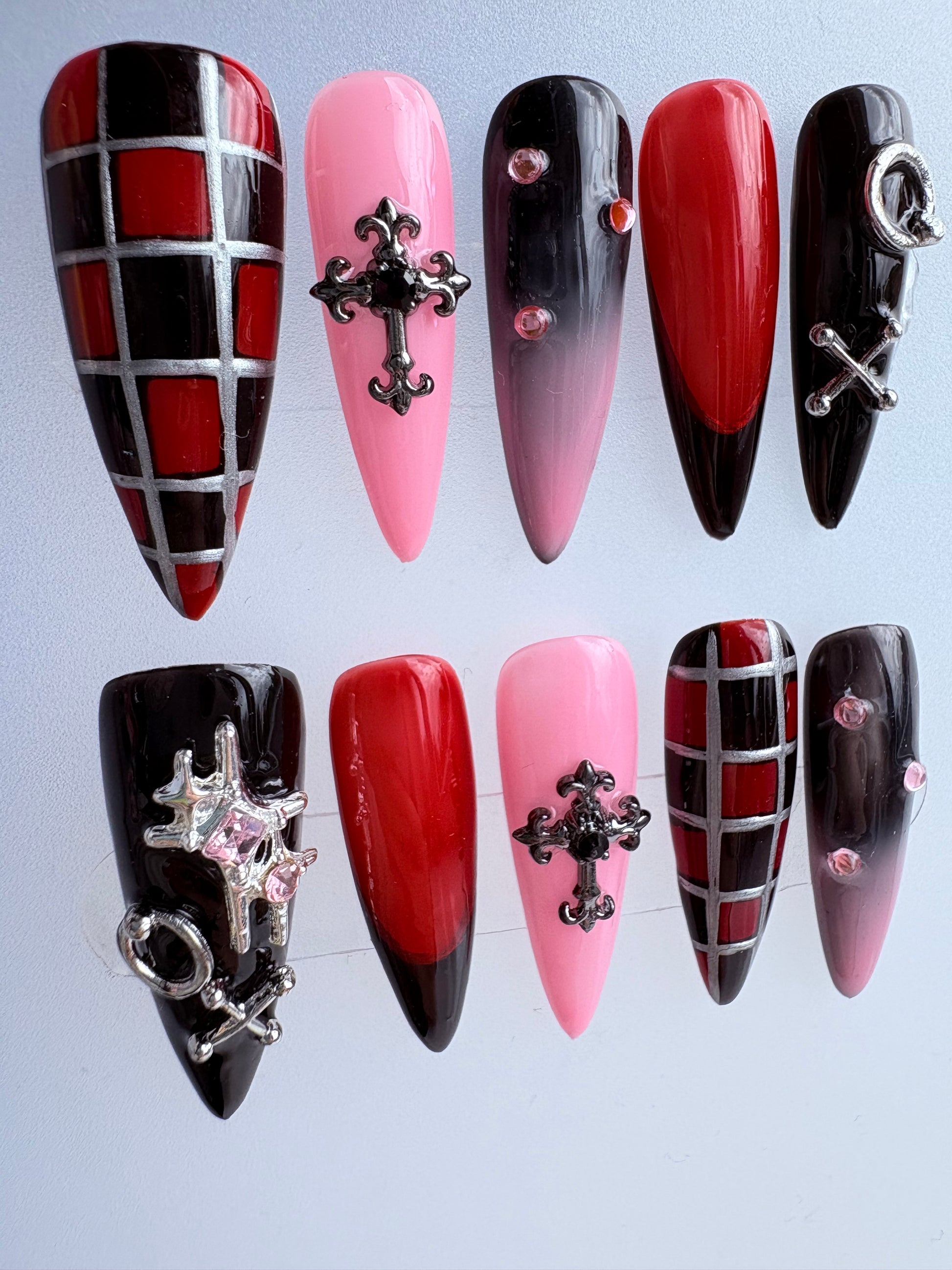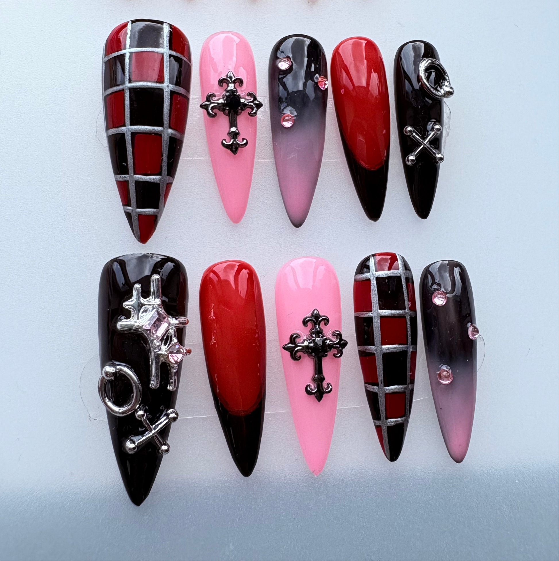 Embrace your inner rebel with Samantha! These gothic press on nails bring a bold vibe with their black, pink, and red color scheme. Adorned with stunning metal charms, these nails are perfect for those who like to take risks and stand out from the crowd. Get ready for an adventure with Samantha!