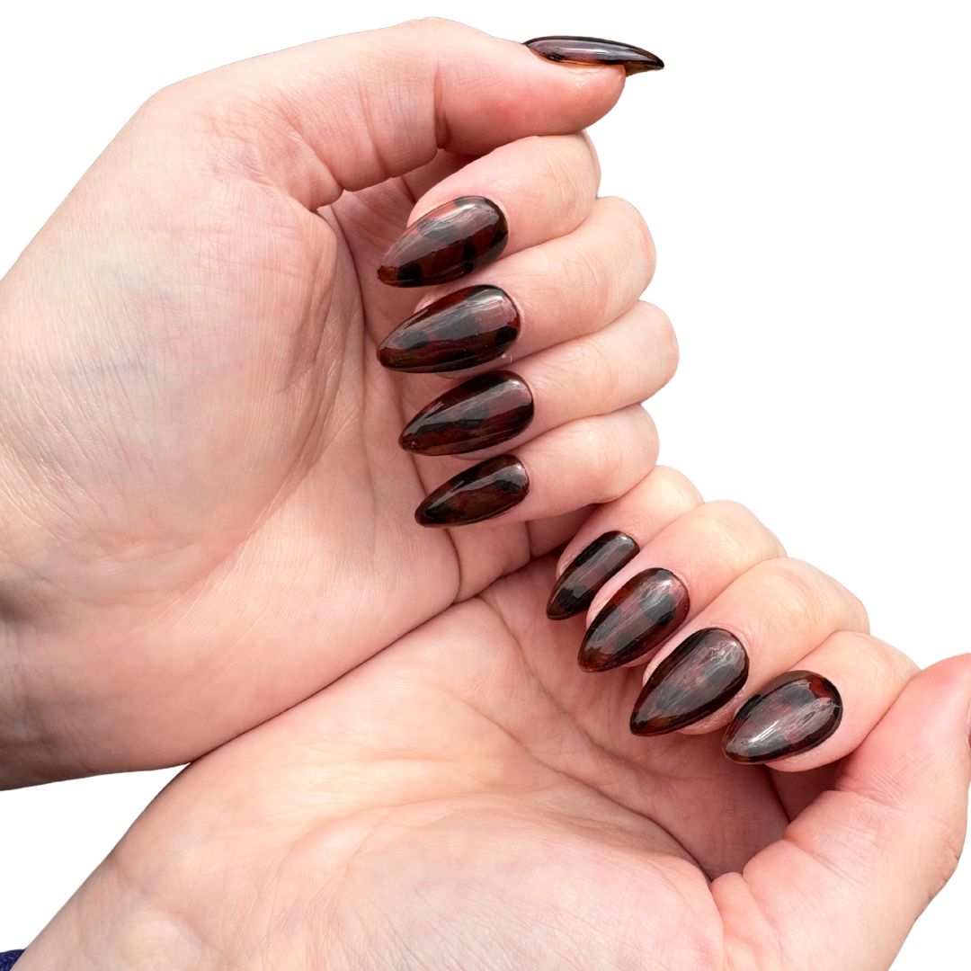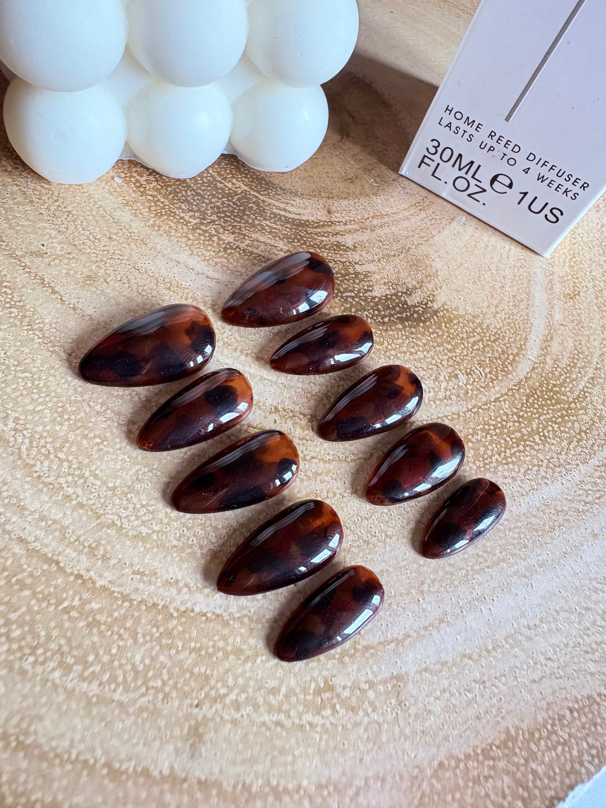 Indulge in elegance with our Iconic Tortoiseshell press on nails, inspired by the timeless beauty of our very own Tortie. These nails exude sophistication and are perfect for any occasion. Make a statement that is both classy and exclusive with our luxurious tortoiseshell nails.